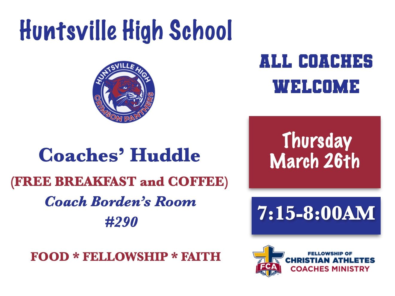 At FCA, we are committed to engaging, equipping, and empowering coaches across Northeast Alabama through our Coaches Huddles. These gatherings provide a space for encouragement, connection, and spiritual growth--helping coaches lead with purpose on and off the field.